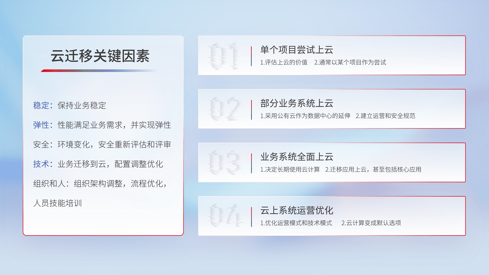 结合实际业务,,从规划设计、、云平台选型、、、、云原生改造、、、、数据迁移、、、、集成交付,,,迁移全过程为客户识别最佳上云路径,,,做好风险识别管理,,,设计网络架构、、、身份权限、、、安全审计合规、、操作审计、、、日志审计、、、监控告警策略、、、、多站点容灾设计等,,,对云上基础设施进行整体规划,,提升IT治理水平,,,以满足弹性、、、高可用、、、、高性能的需求。。。。